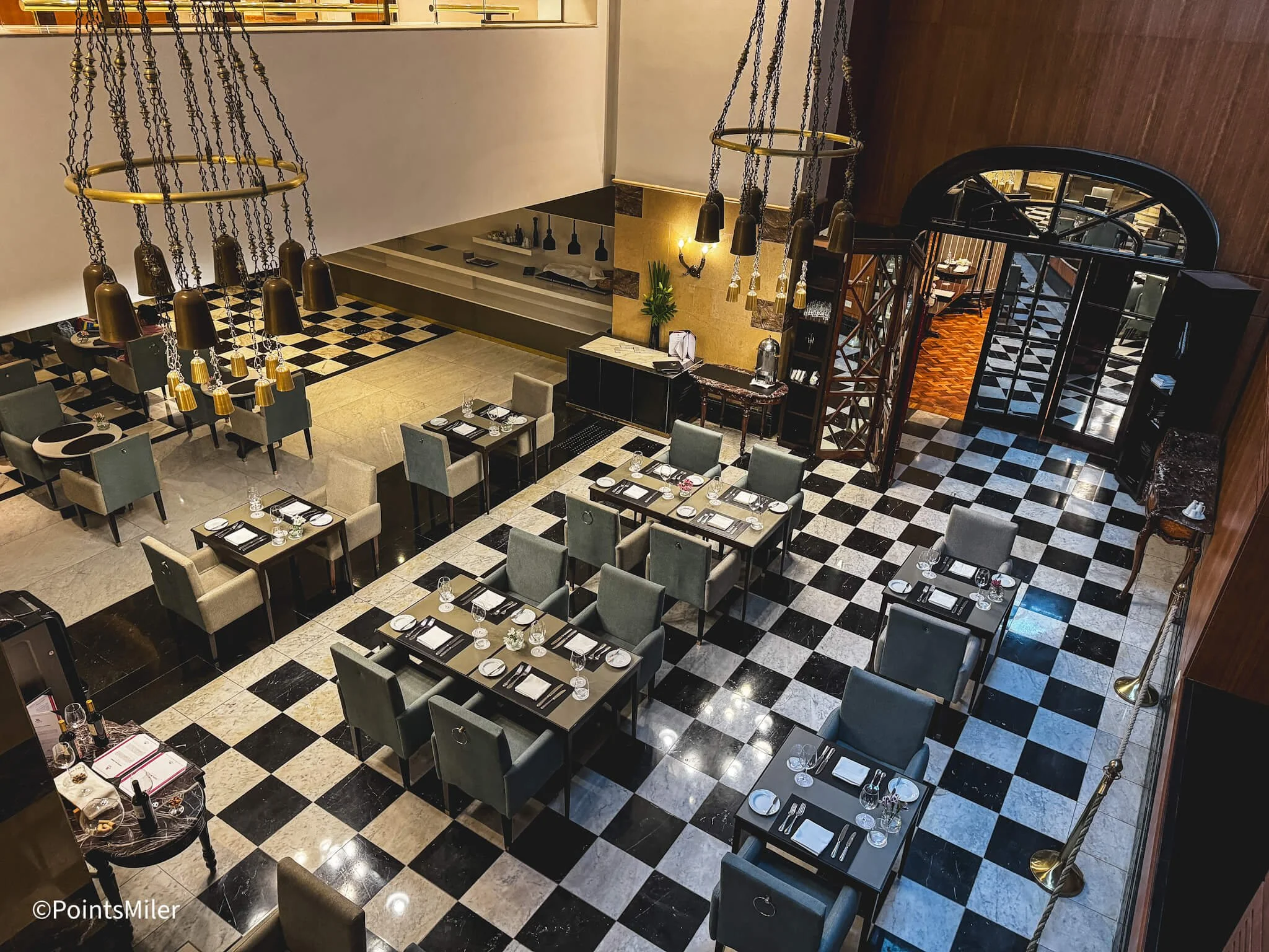 The lobby level featured the hotel’s main restaurant, accented with checkerboard flooring, along with several small shops.