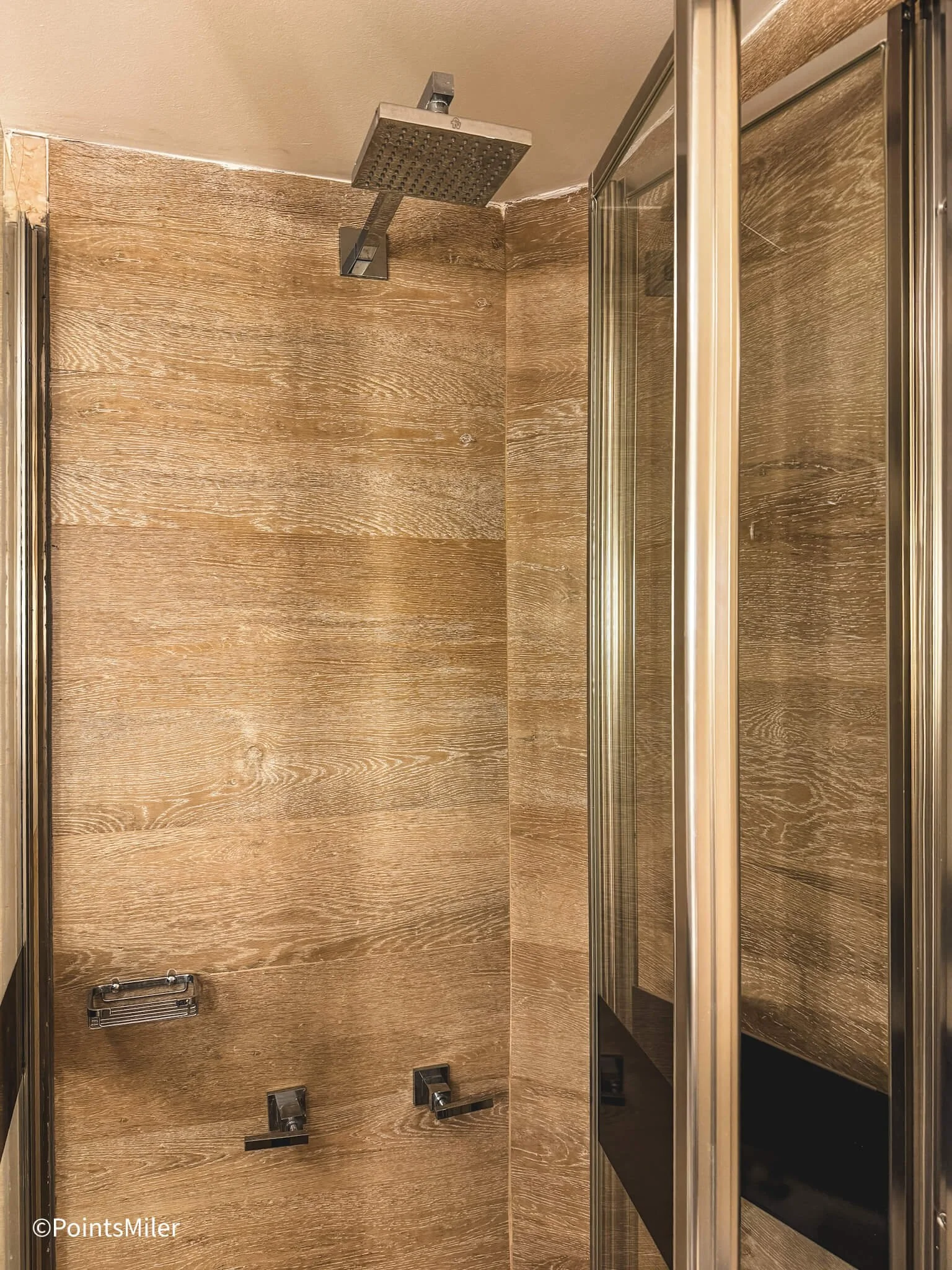 Signs of wear were noticeable, especially around the vanities, which appeared frayed and in need of refurbishing. The same So Vegan toiletries were available, keeping things consistent, though their quality remained underwhelming. The walk-in shower itself was impressively large, featuring dual rainfall showerheads and a sliding glass door that effectively kept water contained.