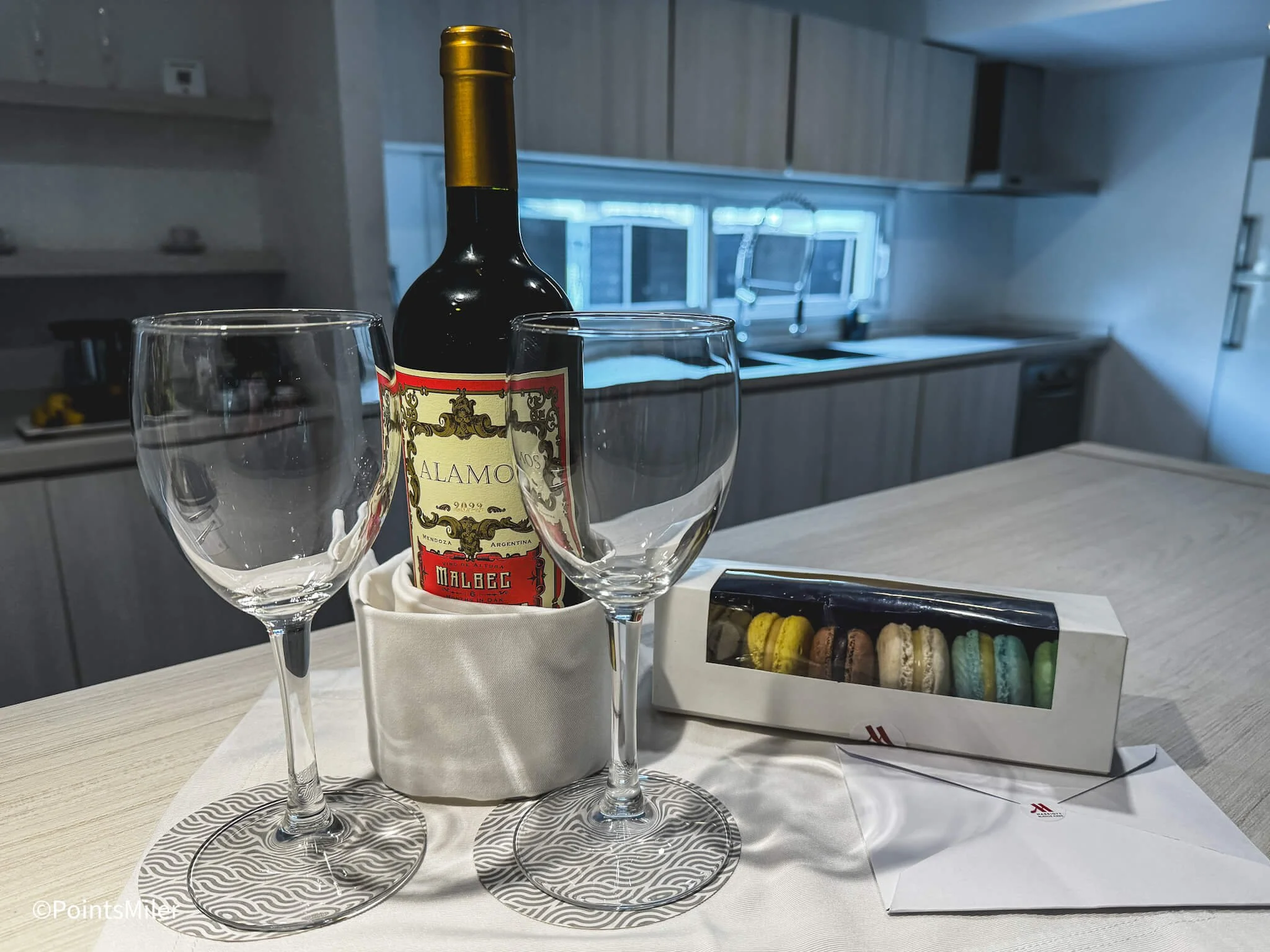 Inside the fridge, I found additional sodas and water, and should I had needed more, the executive lounge was just a short walk away. At the breakfast bar, a welcome amenity awaited: a bottle of Argentinian Malbec and a box of colorful macarons.
