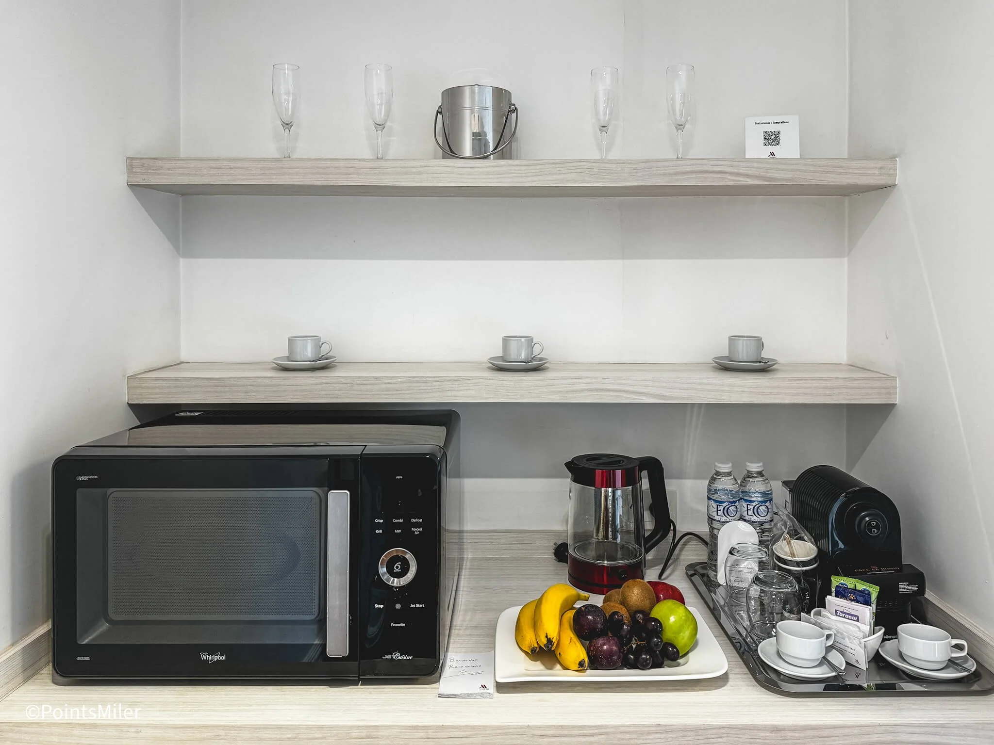 While I had no plans to cook during my visit, the kitchen included a microwave for reheating leftovers or frozen meals. The minibar was thoughtfully stocked with an espresso machine, bottled water, and a bowl of fresh fruit.