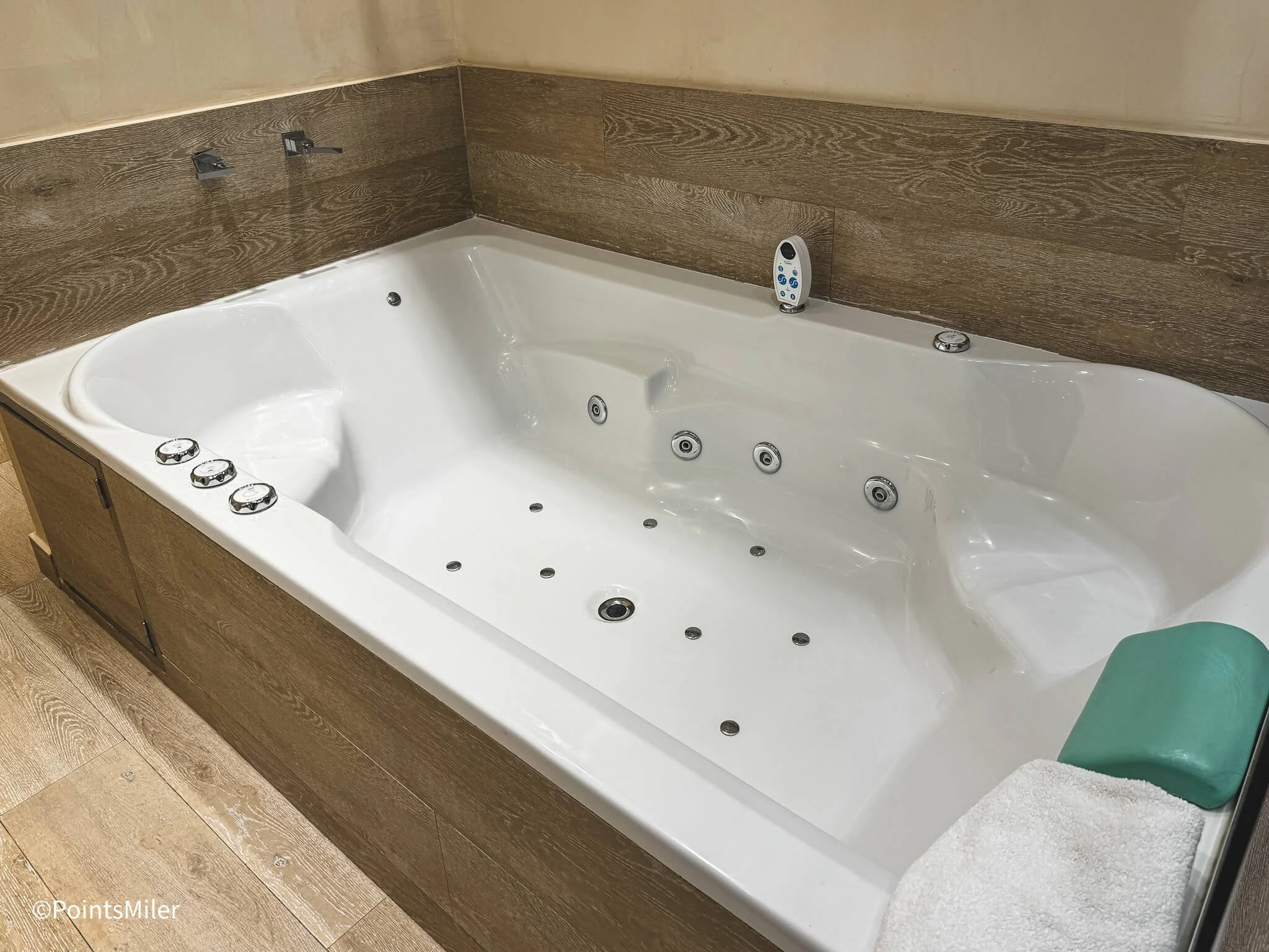 However, the water pressure left much to be desired, resulting in a less satisfying experience. Thankfully, the spacious jetted tub helped redeem the space. Easily large enough for two adults, it came with dual seats and customizable jet settings, offering a relaxing soak after a long day of sightseeing.