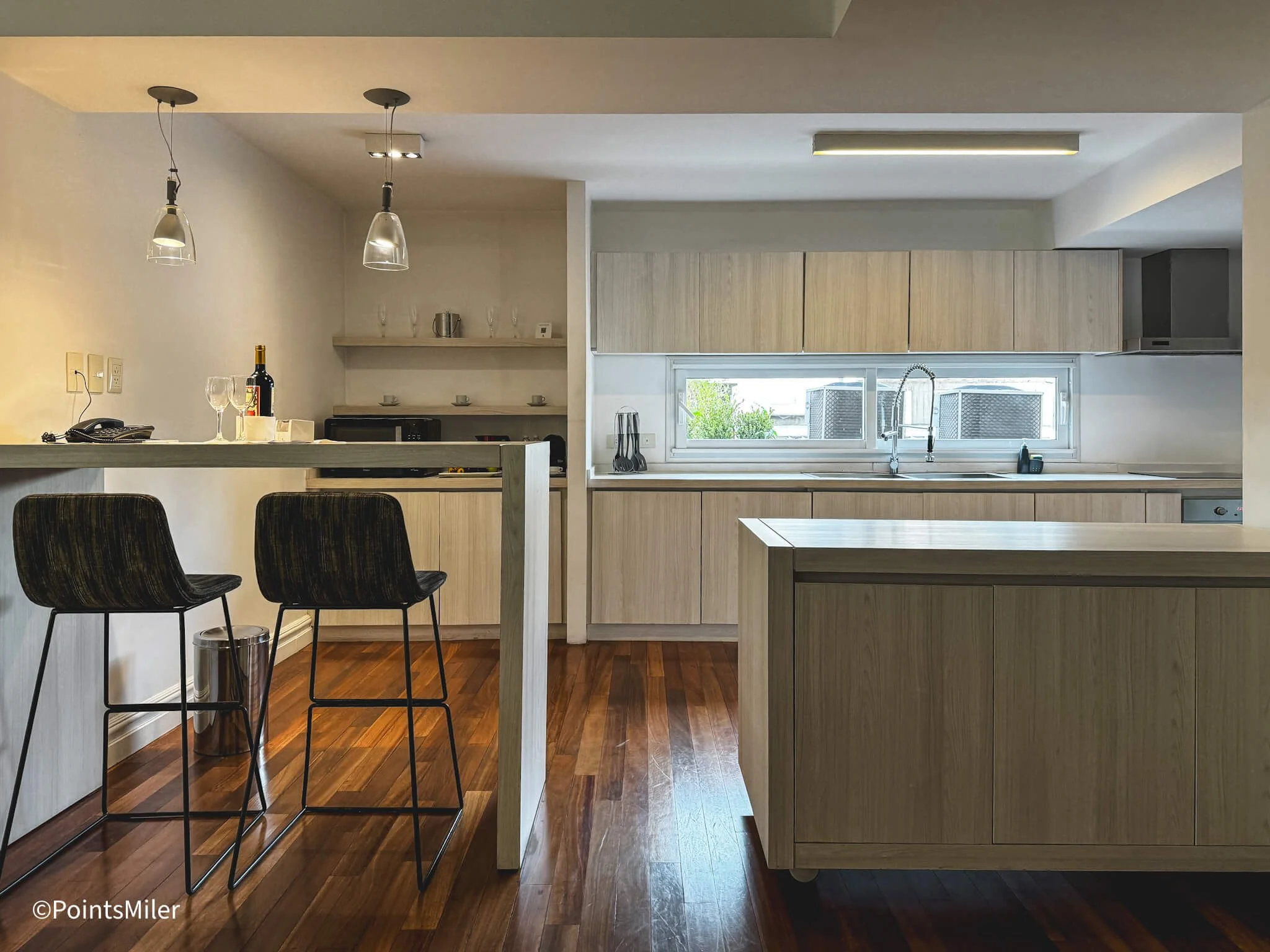 The Apartment Suite measured just over 2,000 square feet, making it one of the largest hotel rooms I’ve ever stayed in. Upon entering, I was greeted by a spacious, modern kitchen complete with an island, breakfast bar, stovetop, dual sinks, and a full-sized refrigerator—ideal for families or long-term stays.