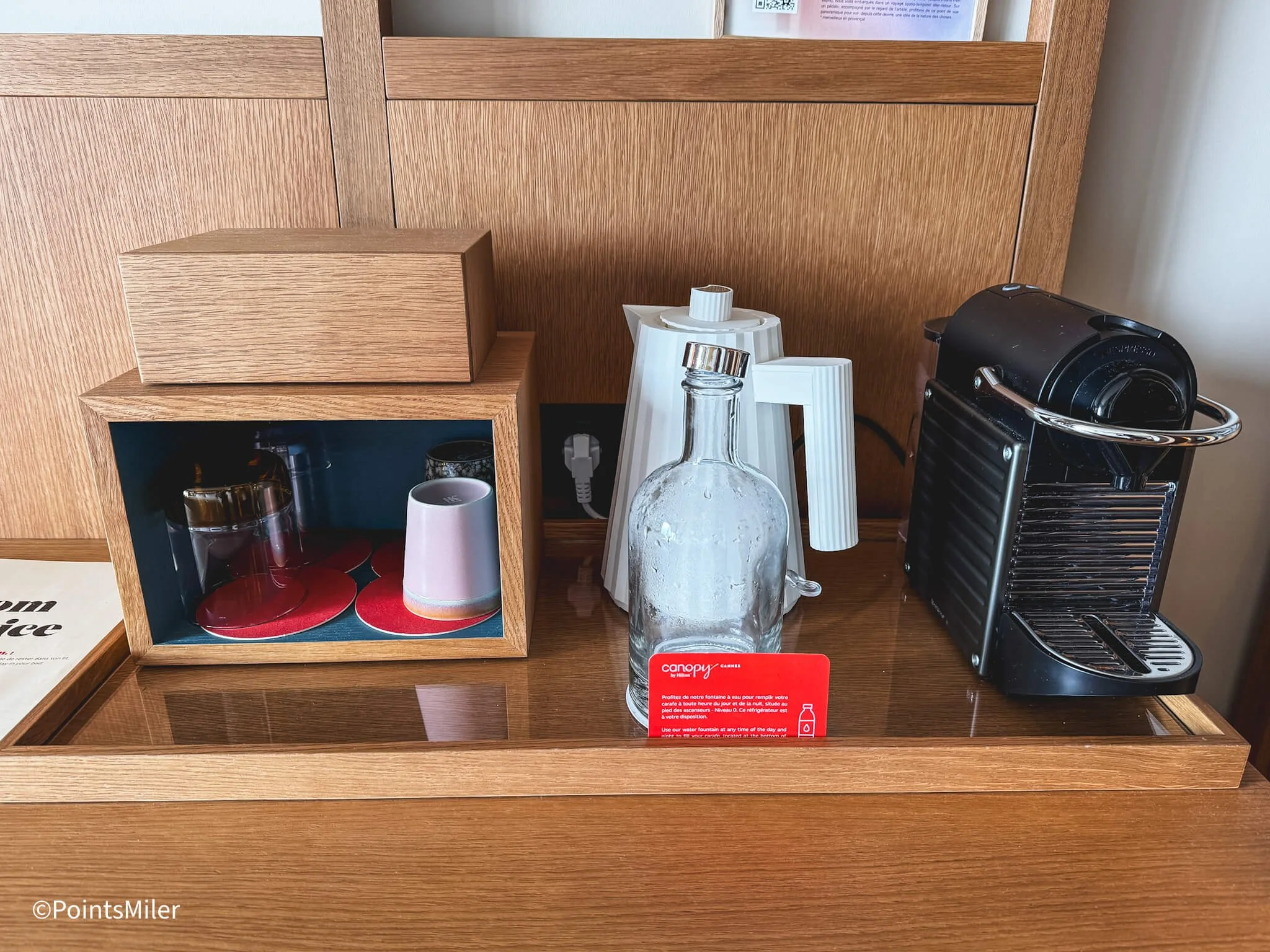 While the minibar didn’t stock alcohol, it did offer complimentary bottled water and Nespresso pods. True to the Canopy spirit, the room included a reusable bottle to refill at the hotel’s filtered water station.