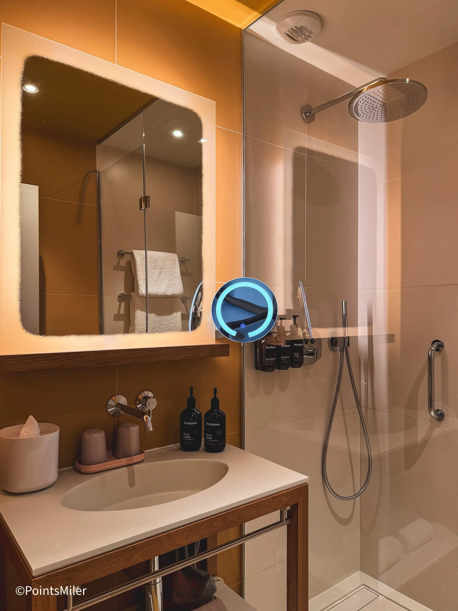 The bathroom featured a single-sink vanity and a walk-in shower. Although the vanity offered limited countertop space, a clever wooden ledge built into the mirror provided extra room for toiletries. Soft ambient lighting overhead added warmth, and the matte countertop’s natural feel fit perfectly with the hotel’s emphasis on sustainability and organic materials.