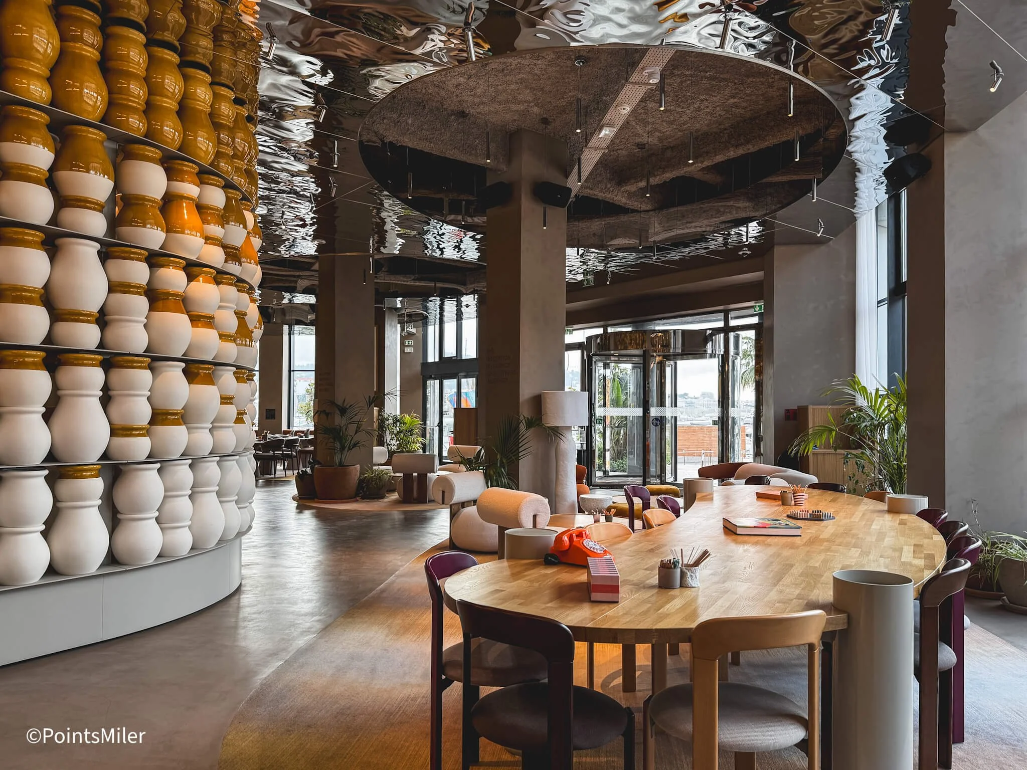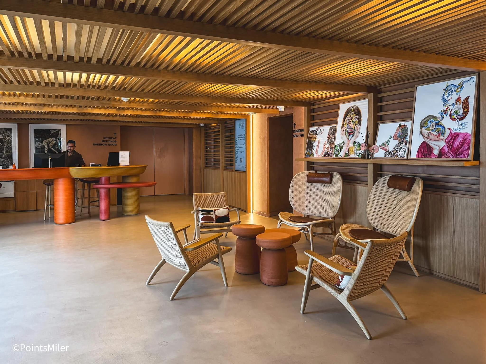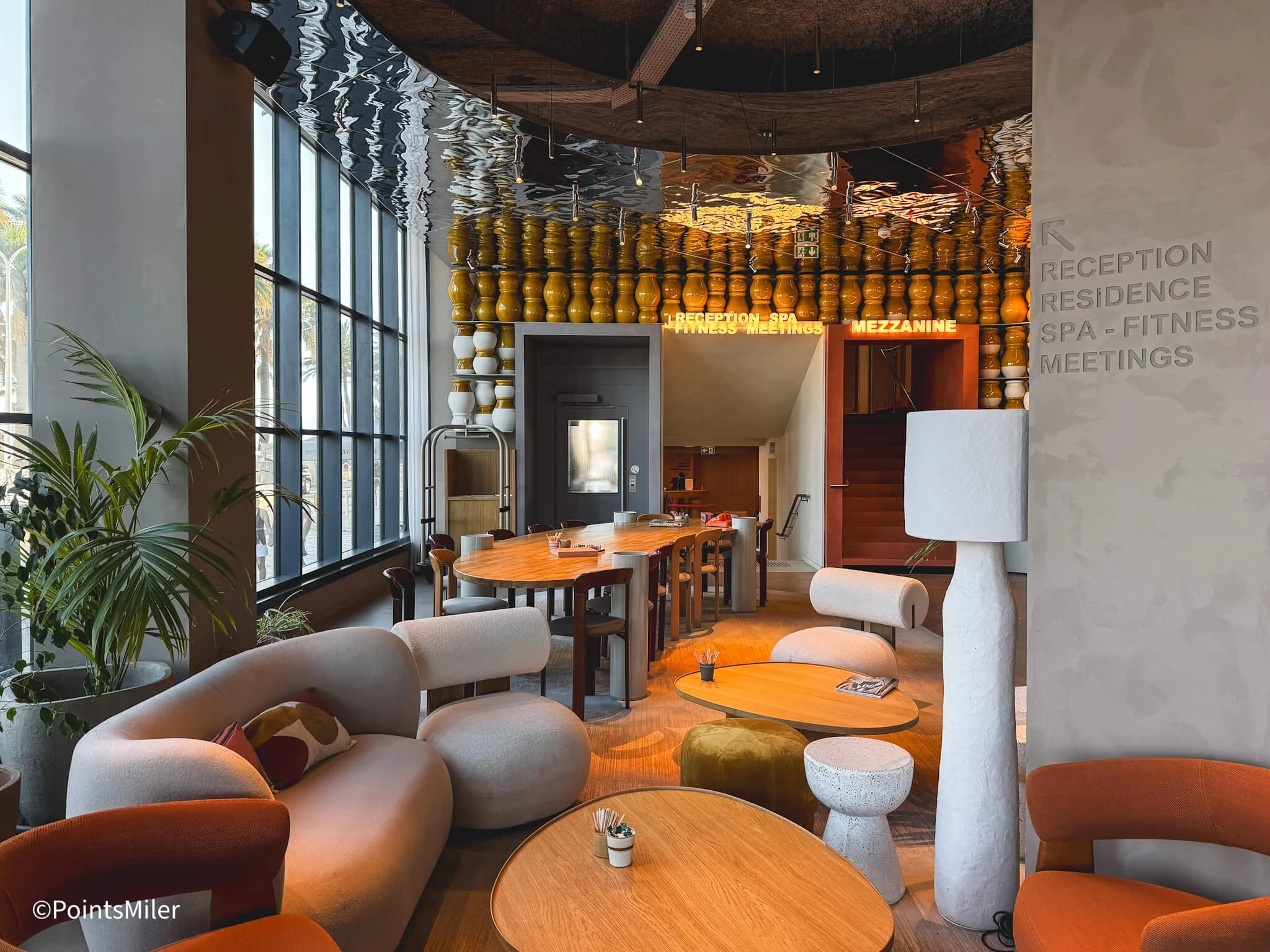 Tall windows filled the space with natural light, and the neutral-toned furniture gave the lobby a cozy yet modern vibe. A reflective ceiling and playful neon signs provided a striking contrast to the warm wooden accents.