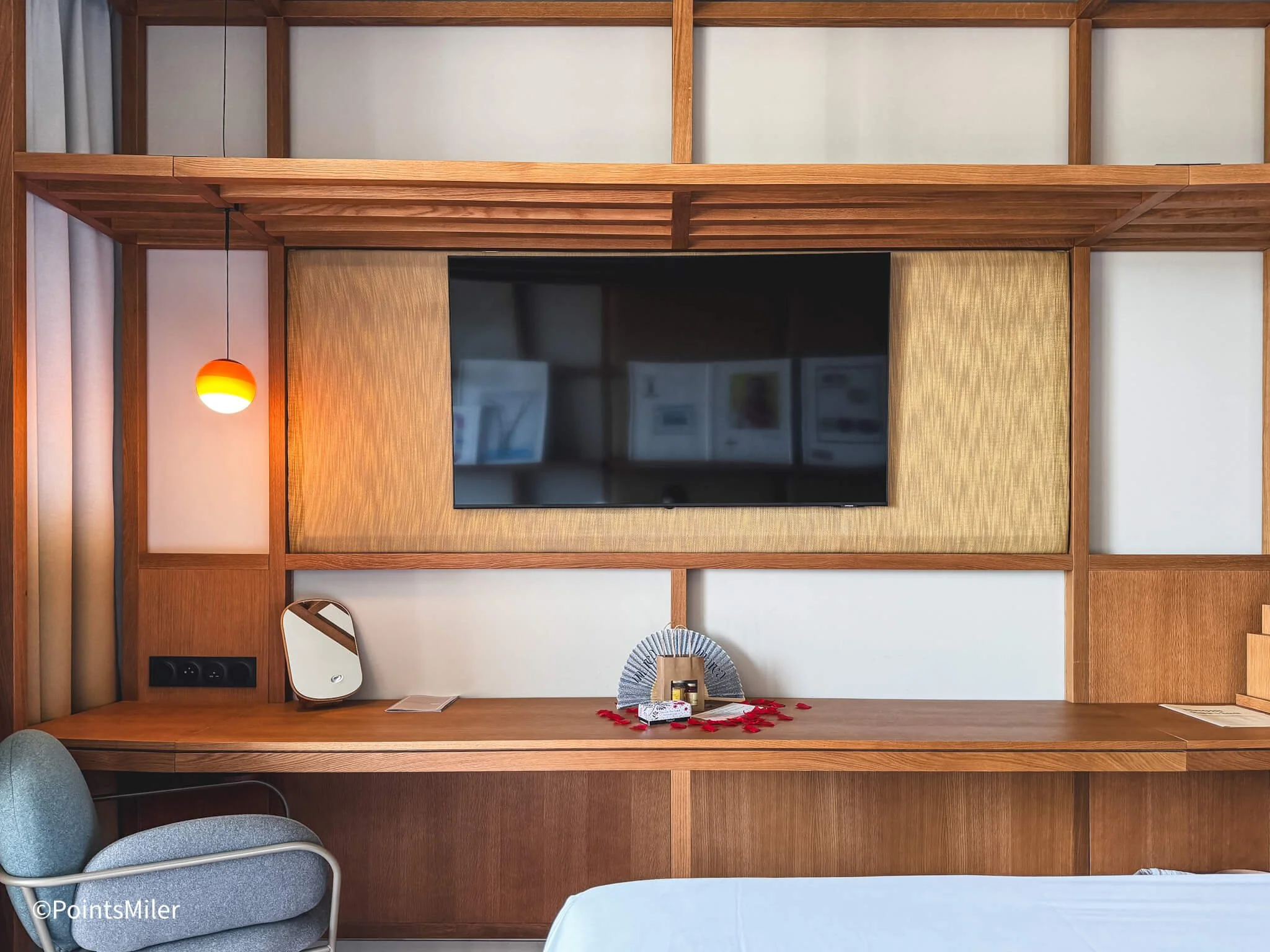 Conveniently, there were plenty of outlets for charging, including a USB-C port delivering up to 65W. Opposite the bed, a wall-mounted smart TV sat against a wooden accent wall, and an elongated desk doubled as a minibar, media console, and, unsurprisingly, my wife’s makeup station.