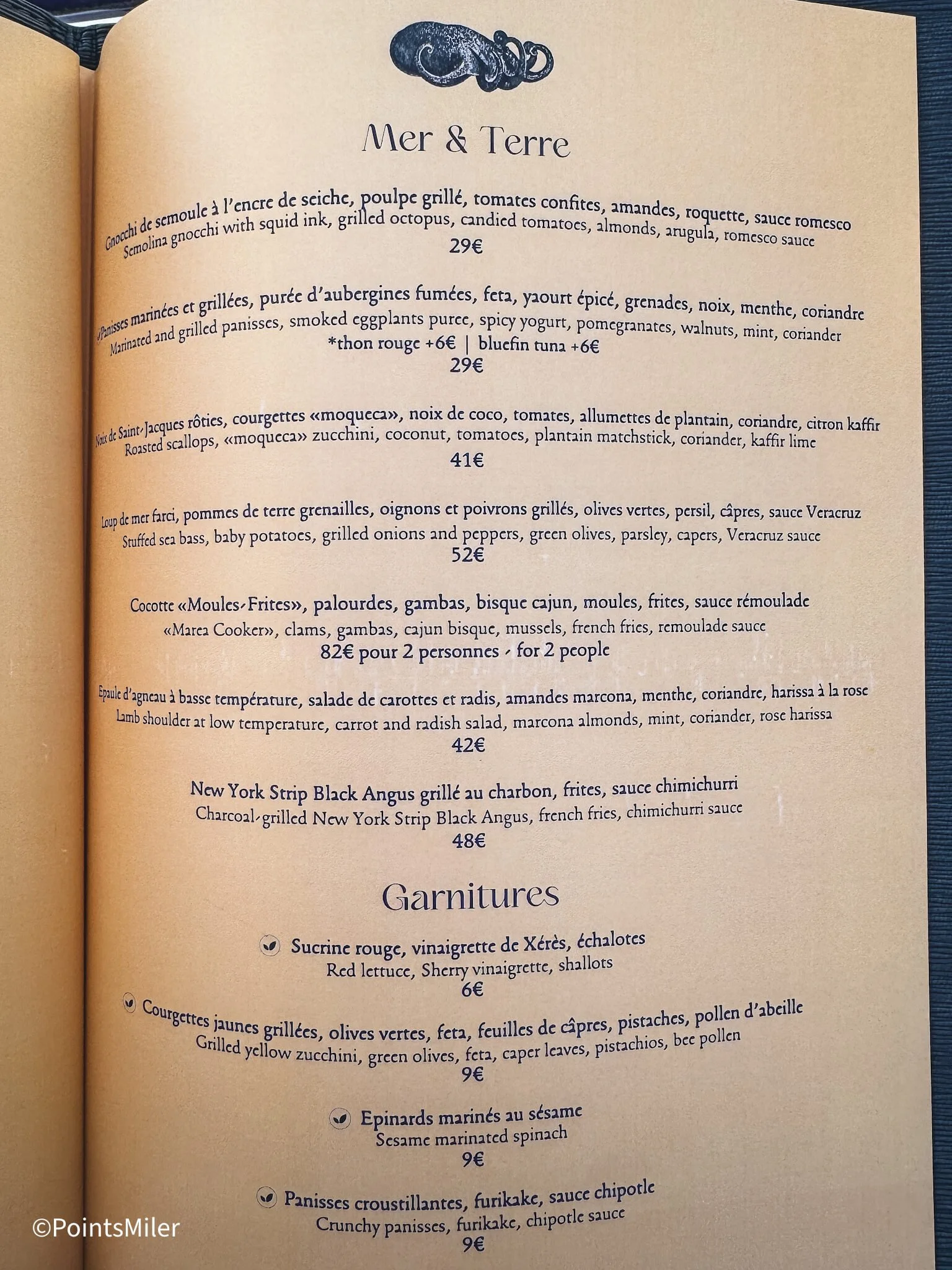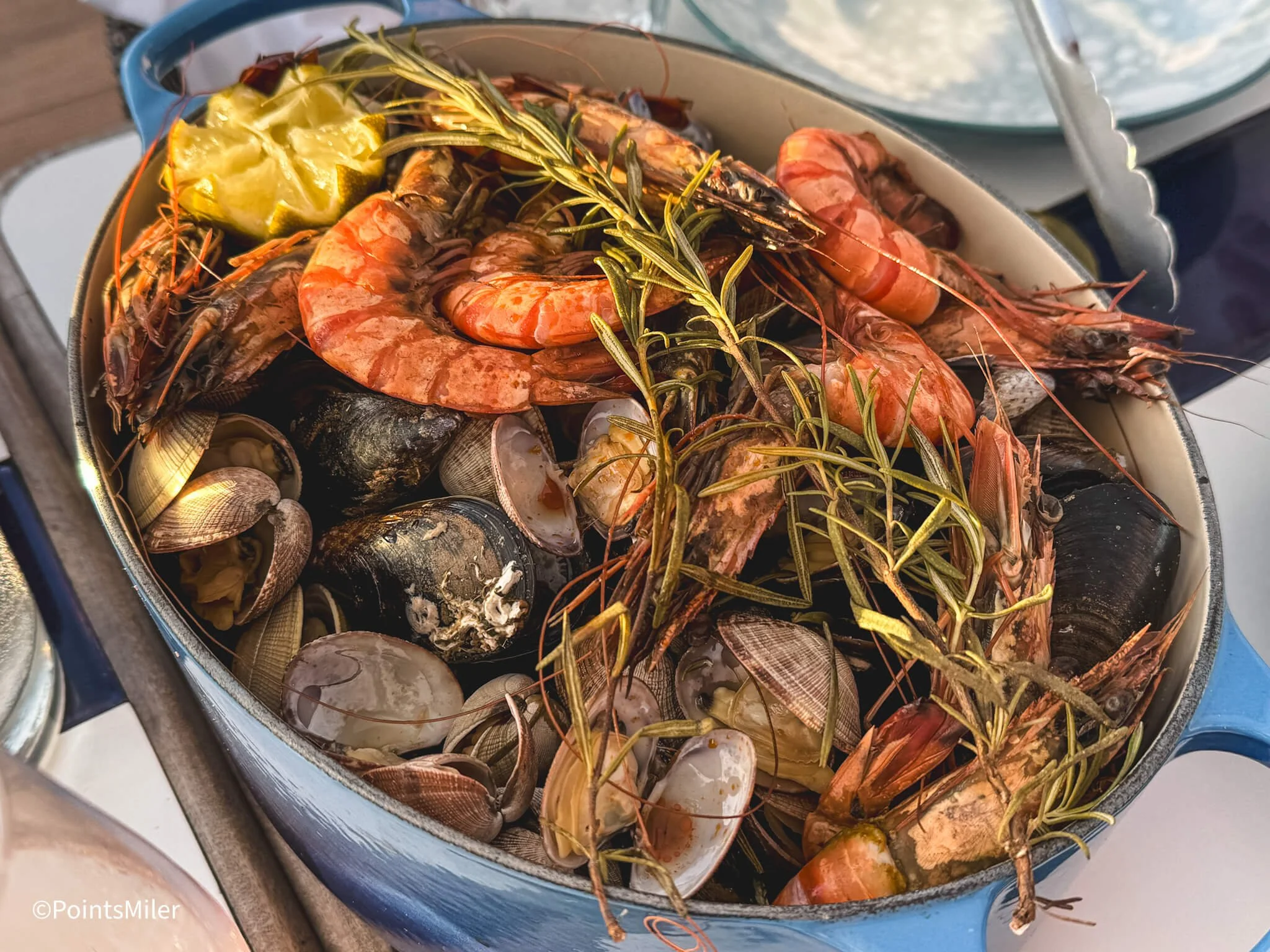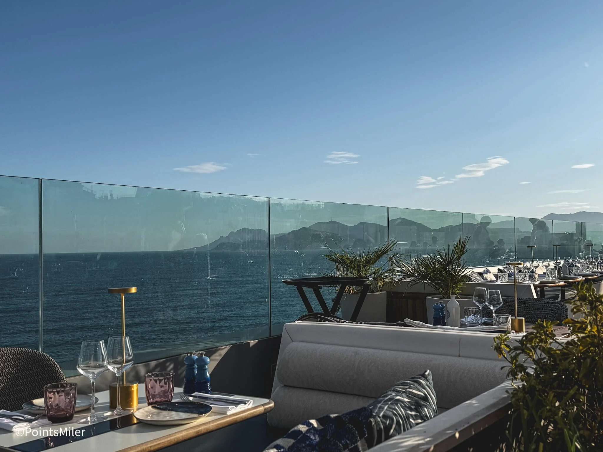 After working out, we headed up to Marea on the rooftop for cocktails and dinner. Marea is a Mediterranean restaurant overlooking the Old Port of Cannes, with sweeping views of the Lérins Islands and the Esterel Massif. Glass railings surround the terrace to provide unobstructed views of the Riviera. A DJ played music that created a lively, club-like vibe.