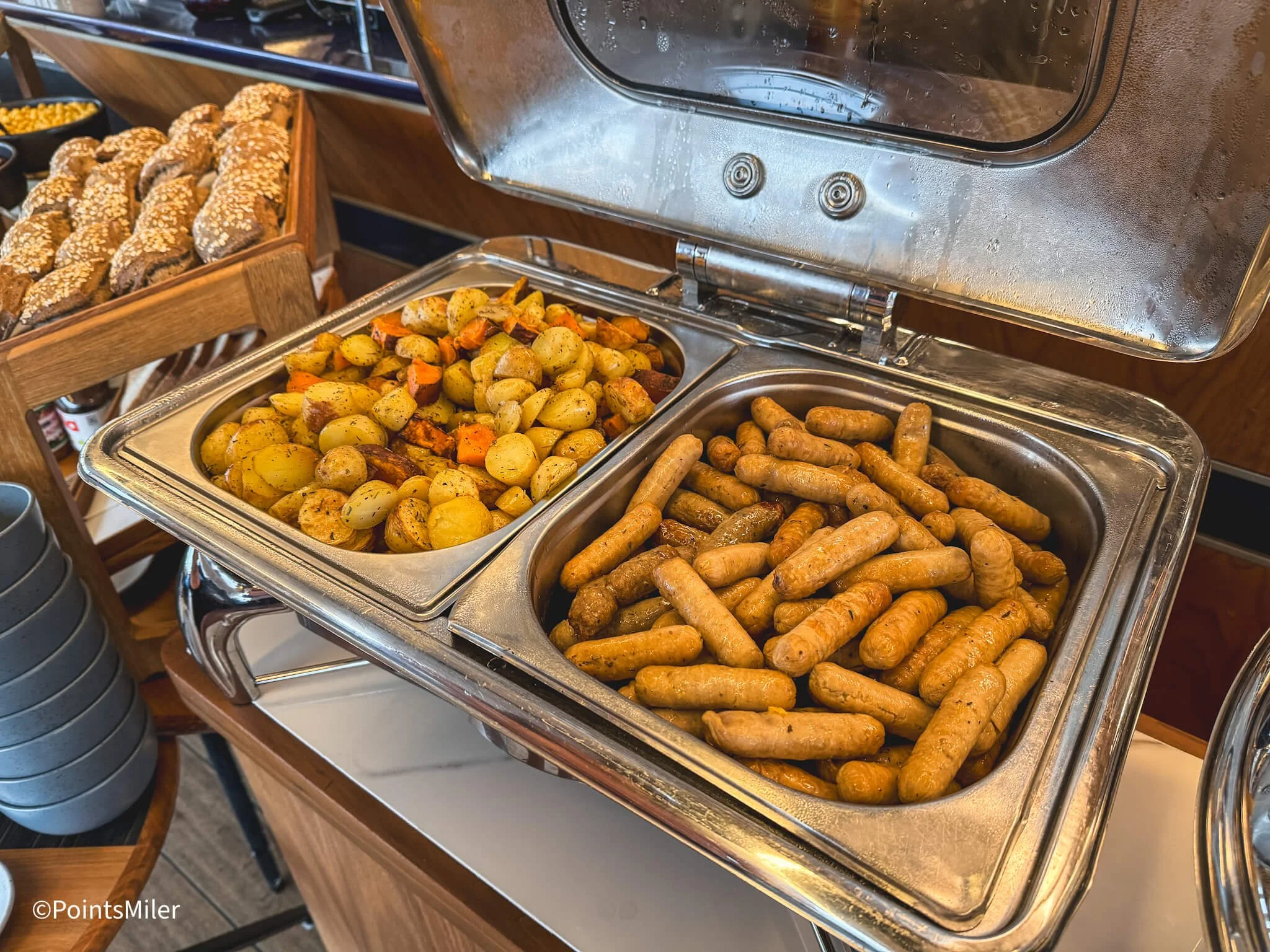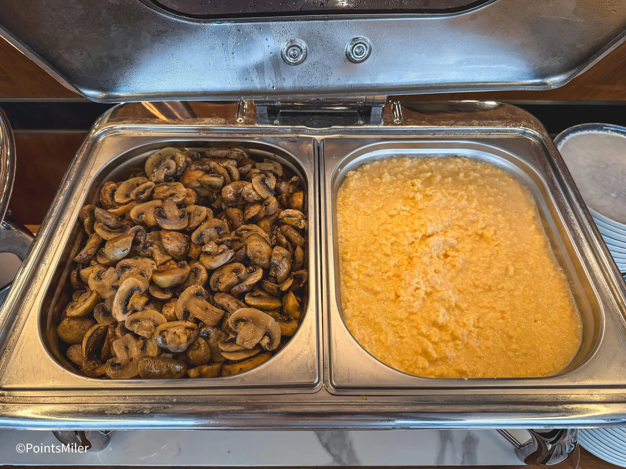 The breakfast was served buffet-style, featuring familiar staples like scrambled eggs, sautéed mushrooms, bacon, sausage, and roasted potatoes.