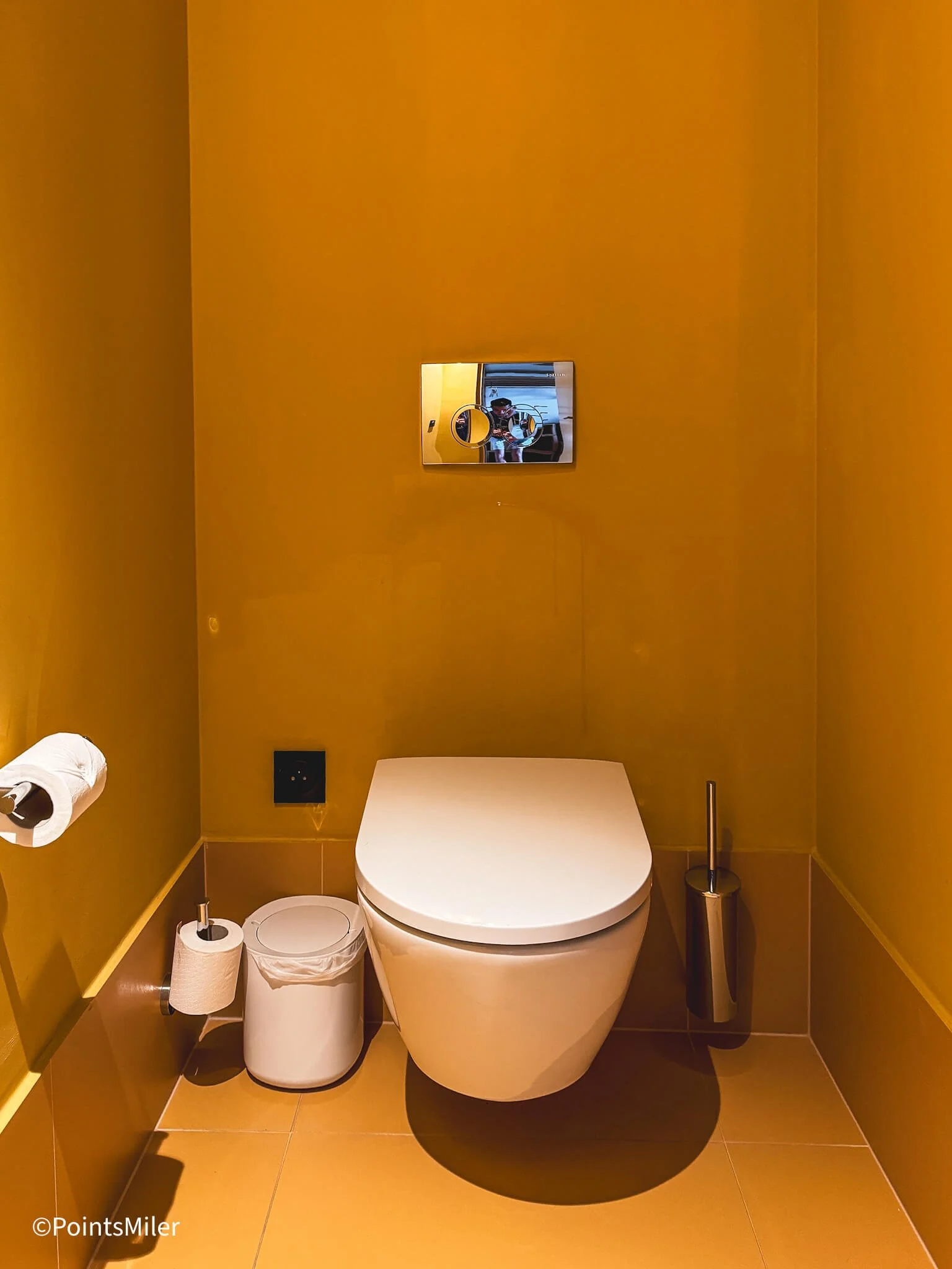 The bathroom was compact, but I appreciated the vibrant pops of color that broke away from the typical black-and-white palette.