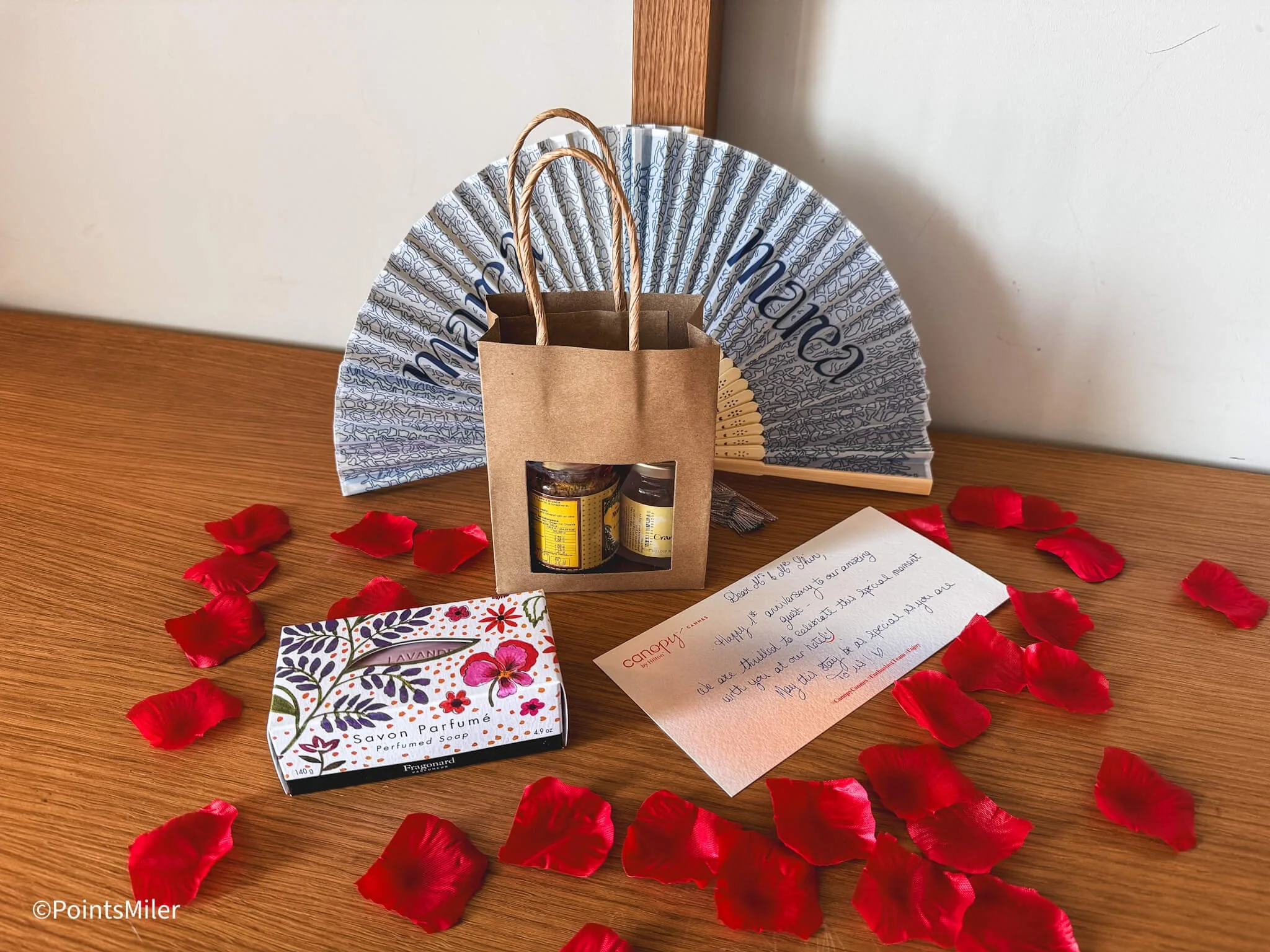 I noticed a thoughtful arrangement of welcome gifts awaiting us on the desk: travel-sized olive oil, tapenade, citrus jam, a full-sized lavender soap from Fragonard, and two folding fans branded with the hotel’s restaurant, Marea. Their handwritten note celebrating our first wedding anniversary made it even more special.
