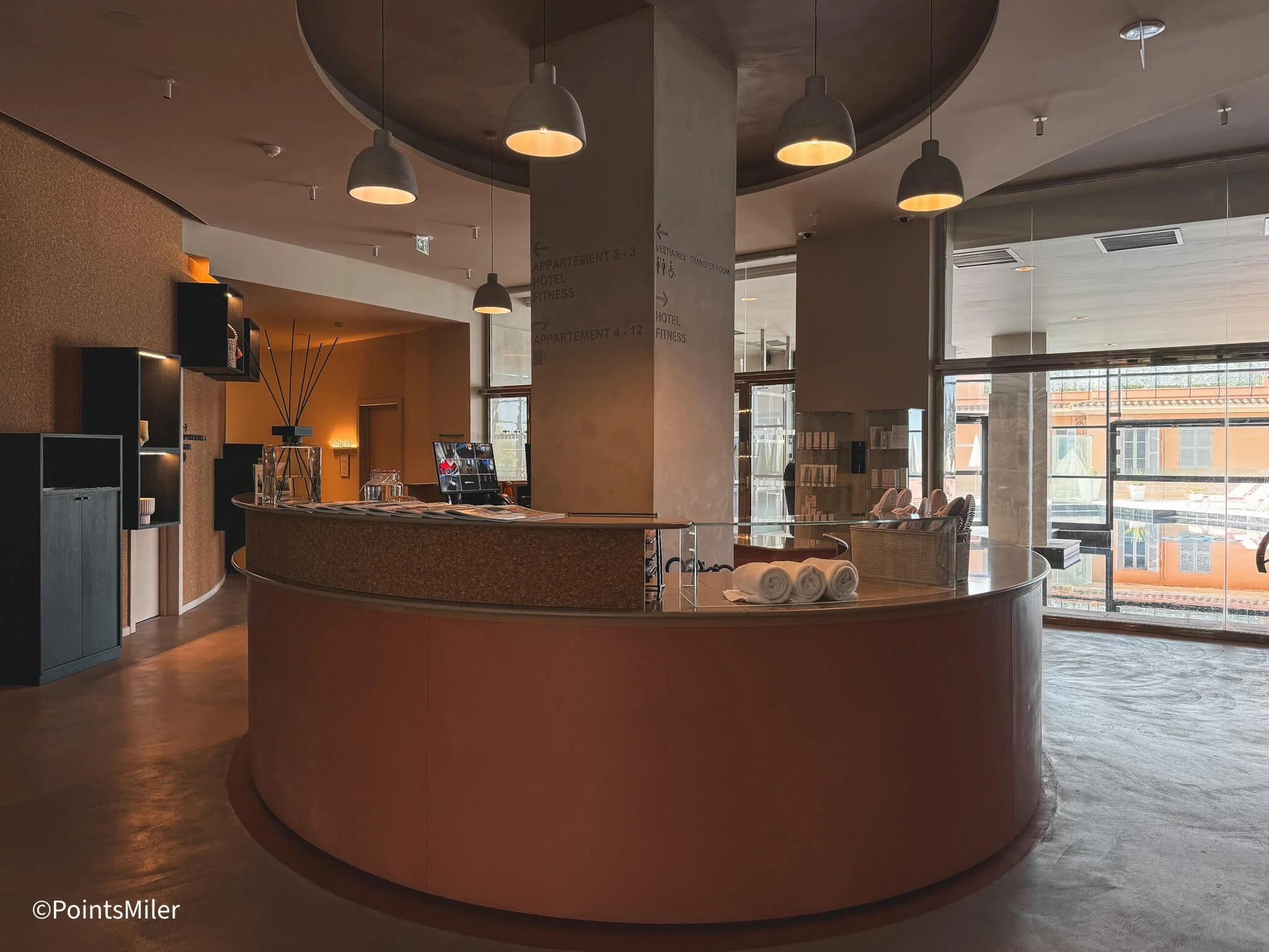 Driving to the Canopy by Hilton Cannes was a bit hectic due to extensive construction around the hotel. We left our car with the valet and stepped inside the inviting lobby, designed across two levels. The lower level featured two check-in desks and a few chairs.