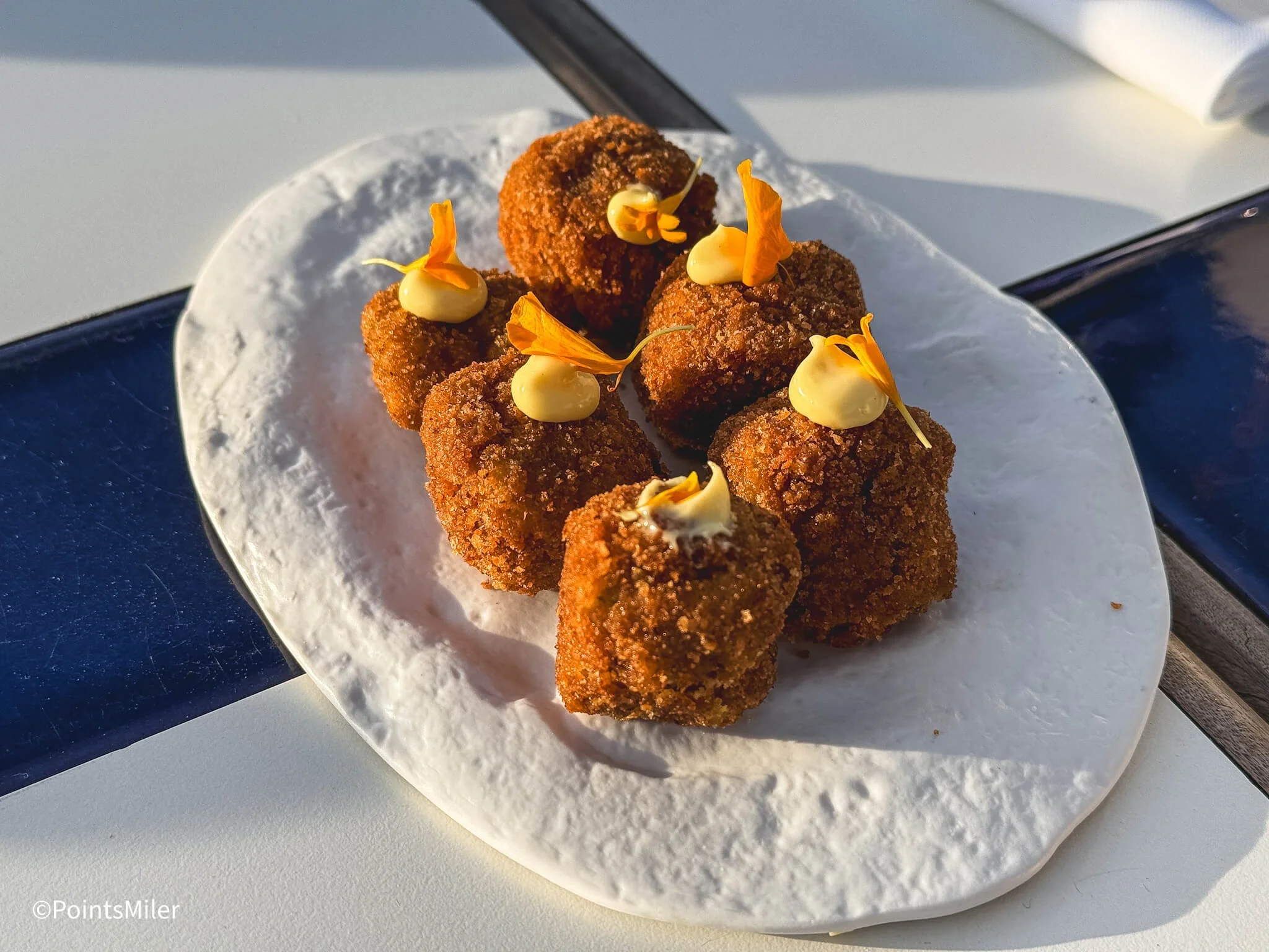 The menu focused on fresh seafood, though there were also a few meat and vegetarian options. Since I was with my wife and a few friends, we ordered several dishes to share. We started with crab arancini seasoned with curry, which were delicious bite-sized starters that set the tone for the meal.