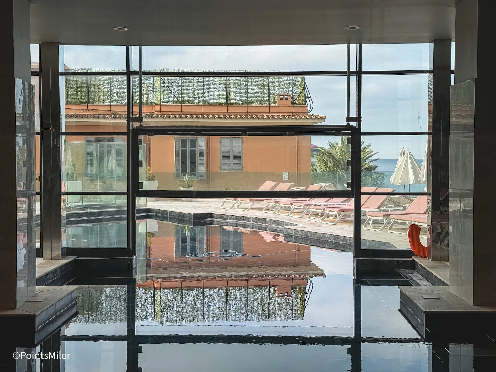 The high ceilings above the indoor pool and the view of the French Riviera from the outdoor area made the space feel open and inviting. From the spa reception, a short walk led to the dry sauna and steam room on a lower level.