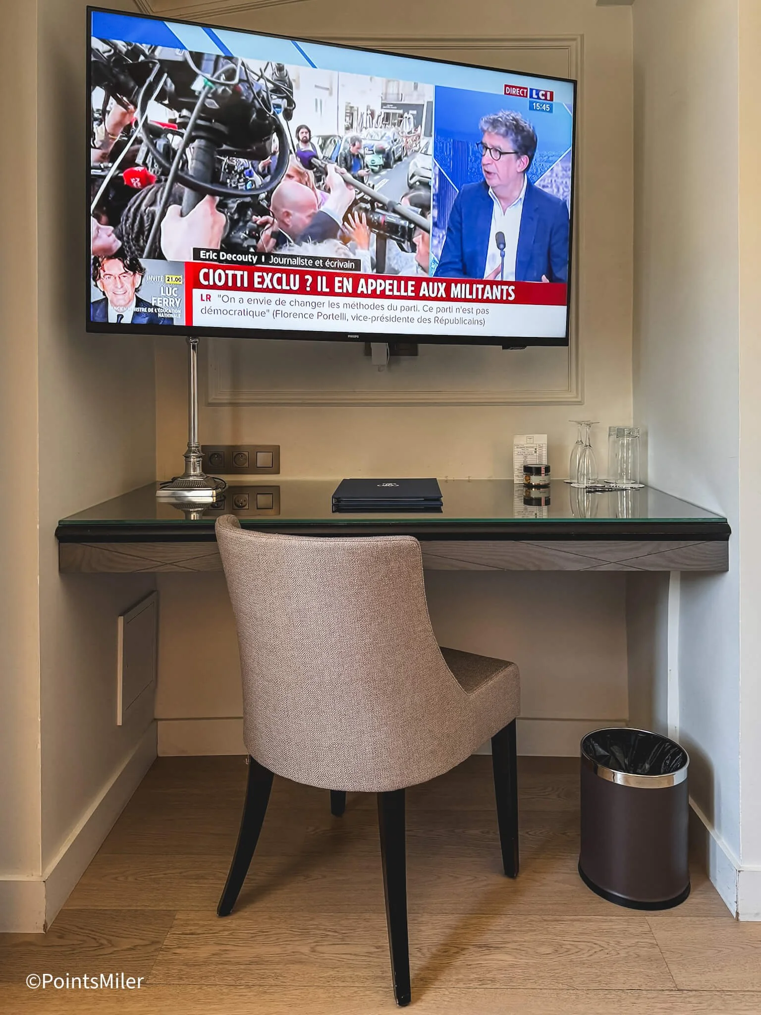 Across from the bed was a dedicated work desk paired with a large wall-mounted TV. While the screen didn’t obstruct the desk space, it might not be the best viewing angle if someone is working.