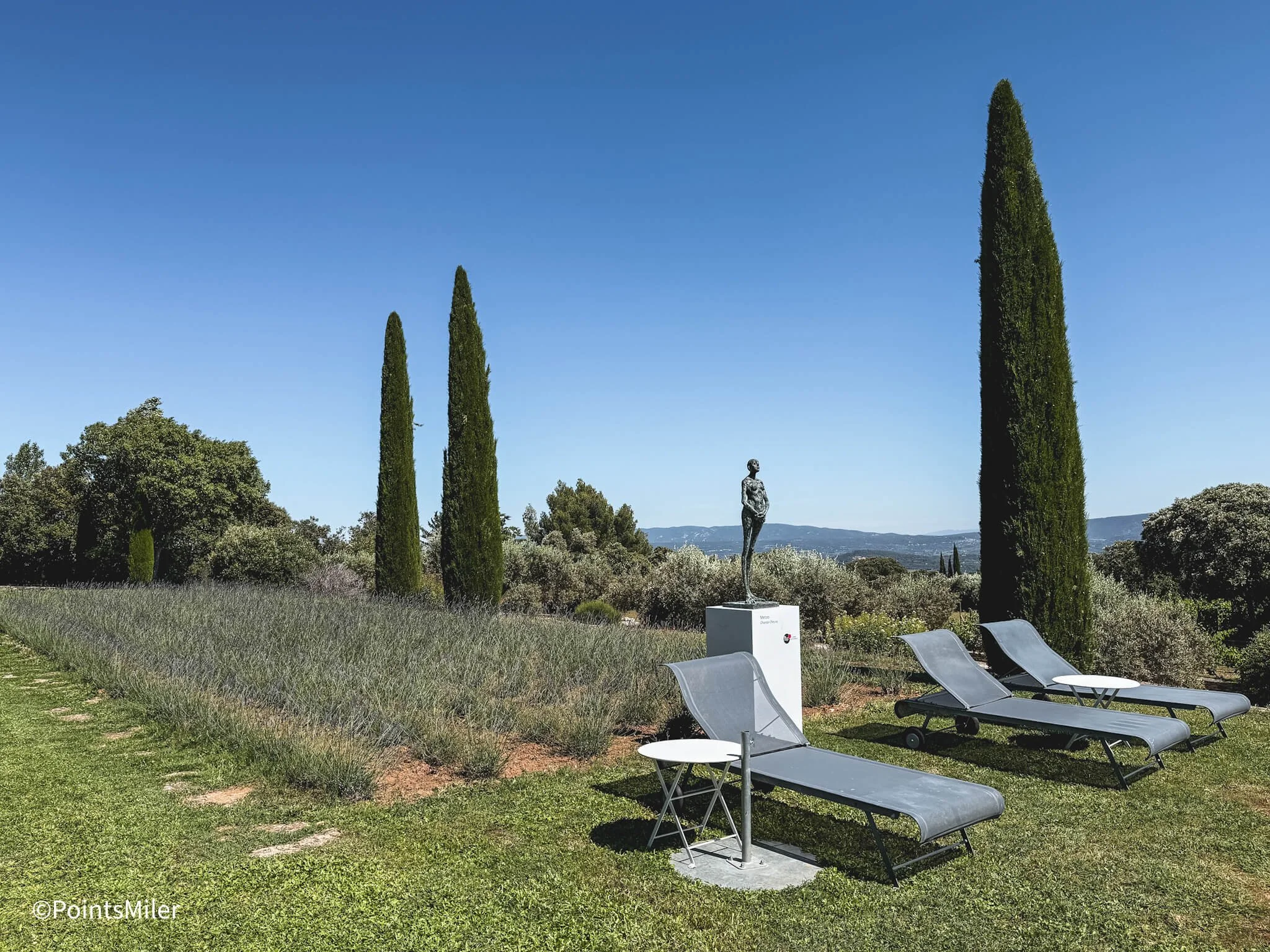 The hotel grounds were absolutely beautiful. During my visit in June, lavender was in full bloom, filling the air with its signature fragrance and adding vibrant color to the landscape. Sculptures and artwork were thoughtfully placed throughout the garden, creating a peaceful and visually rich environment. Perched on a hilltop, the property offered sweeping views of the surrounding greenery, which made every moment outdoors feel serene and expansive. The weather during my stay was perfect, making it an ideal time to enjoy the outdoor infinity pool and soak in the beauty of the Provencal countryside.