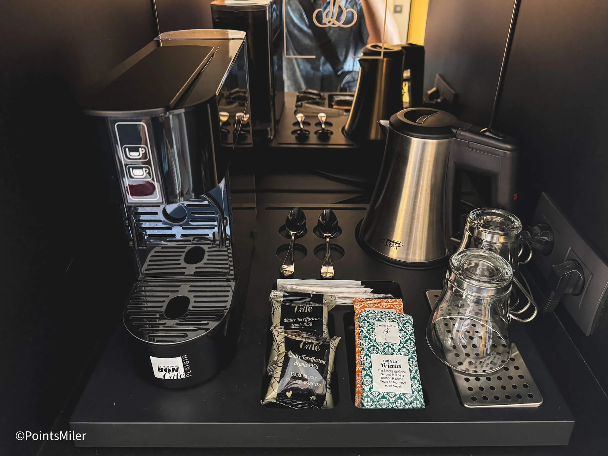 Just above it sat an espresso machine and a variety of tea bags to cater to all beverage preferences.