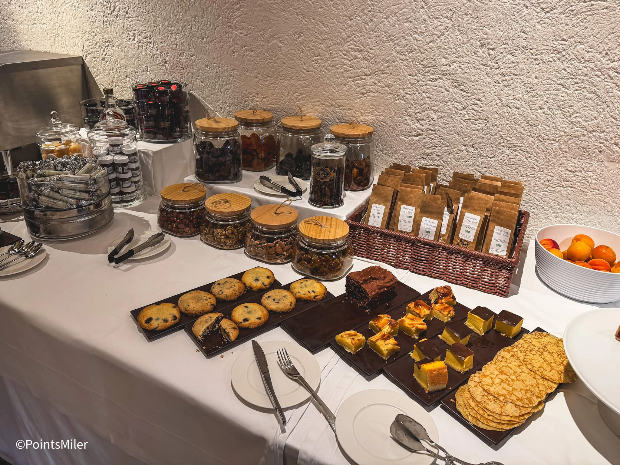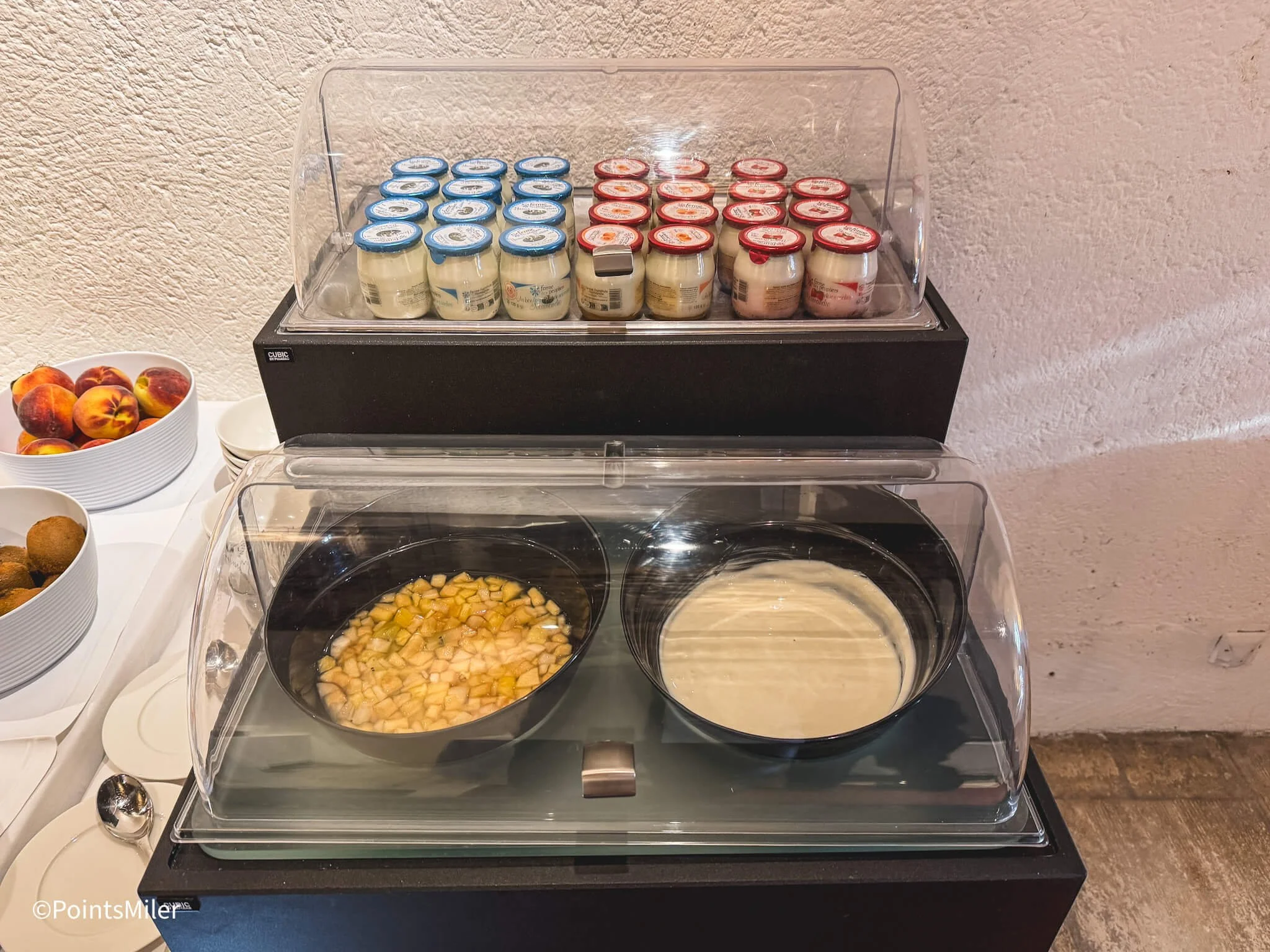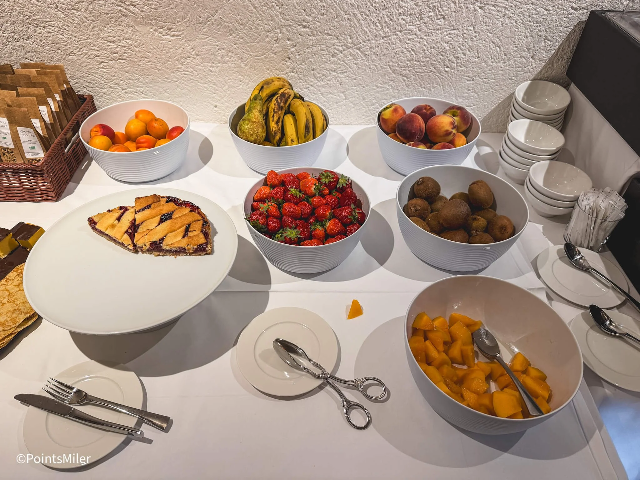 For pastries, there were petite croissants, pain au raisins, and pain au chocolat. Whole fruits were available, although most guests opted for the pre-cut fruit salad for convenience.
