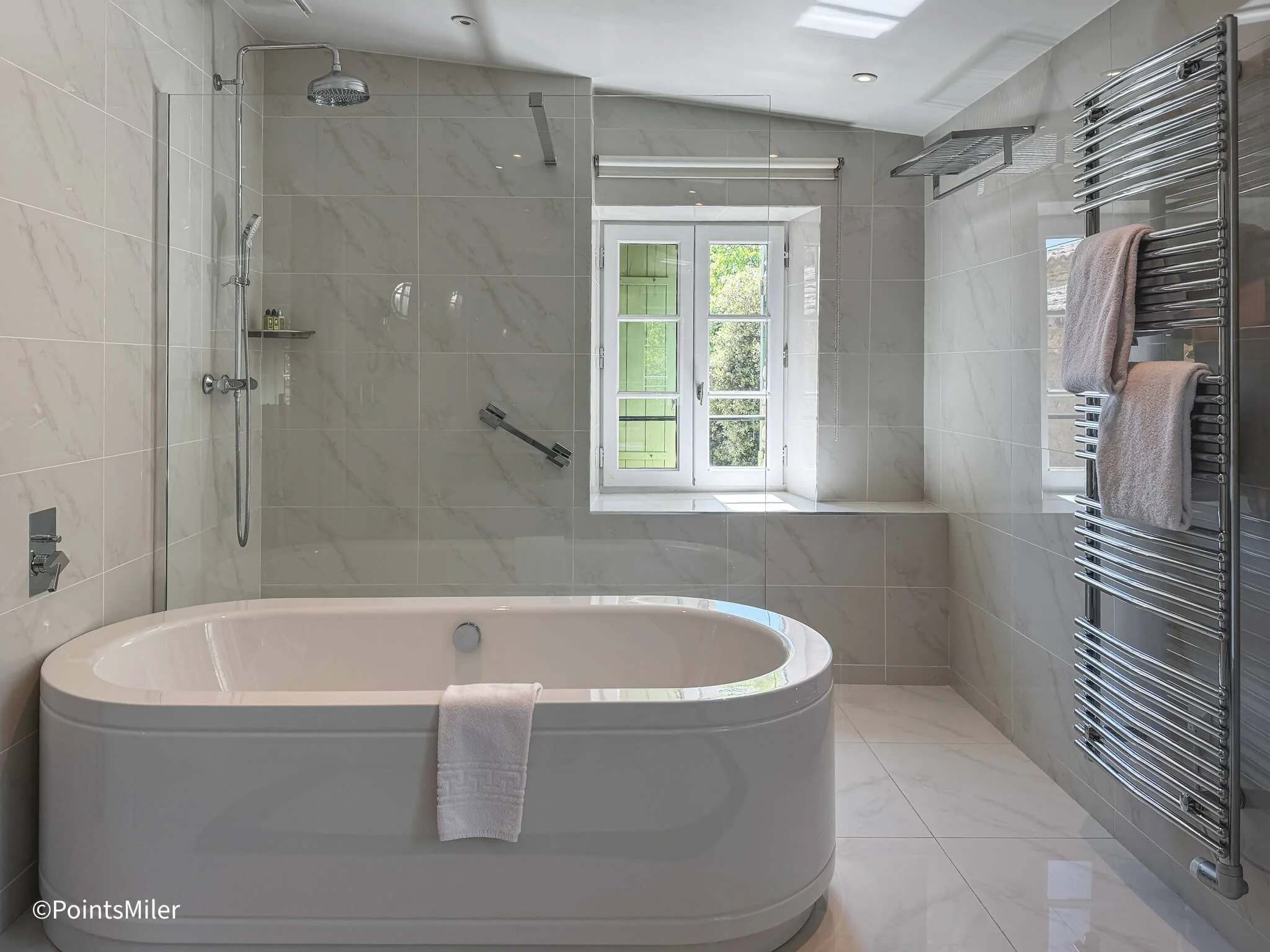 There was also a deep standalone tub, generously sized for two people. For anyone planning to take a bath, I recommend placing extra towels on the floor, as the glossy tiles can get quite slippery. Across from the main bathroom was a separate water closet, which provided added privacy.