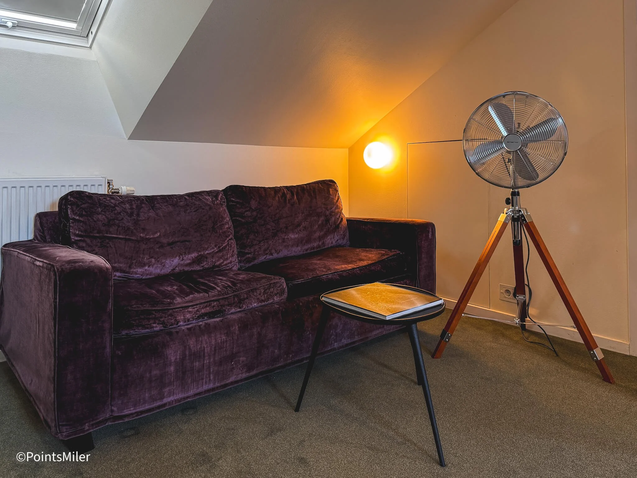 The small nightstands with bedside lamps offered minimal surface area for storing phones or personal items, and another sofa, a small coffee table, and an industrial fan filled one corner. Like Hotel Reisen, Story Hotel Riddargatan did not offer air conditioning in any of its rooms.