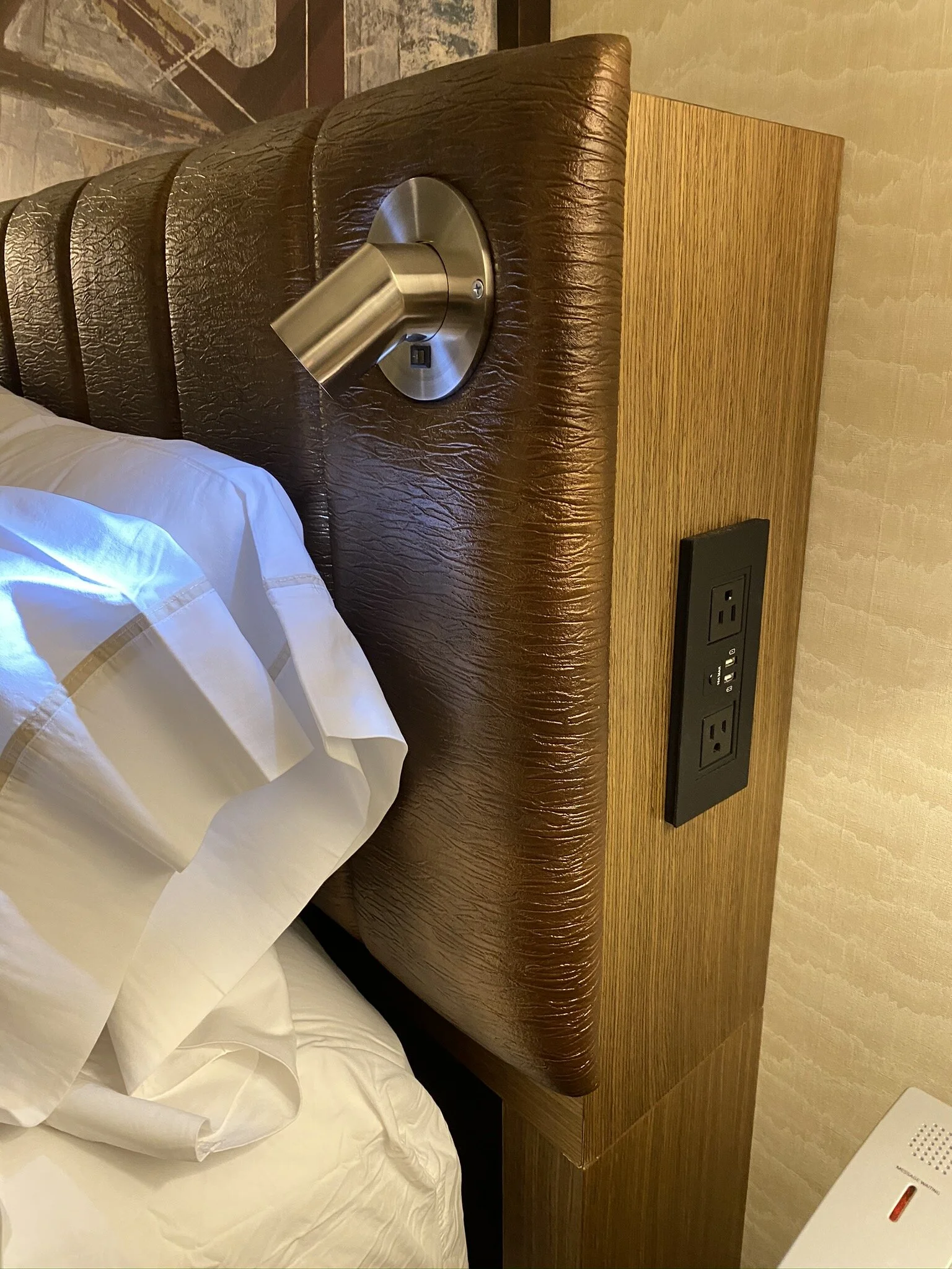 The headboard was wrapped in leather and had two reading lights on each side. The USB ports and outlets were built into the headboard, which was ergonomic but also problematic for couples because they were only accessible on one side.